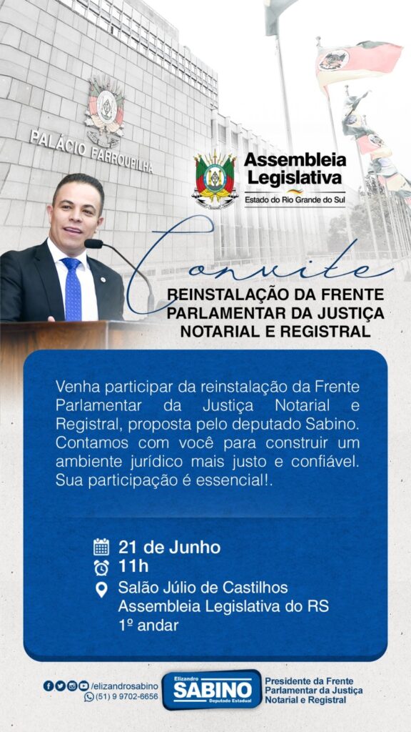 A Anoreg/RS e o Fórum de Presidentes convidam todos os notários e registradores gaúchos para participarem do ato de ⚖ Reinstalação da Frente Parlamentar da Justiça Notarial e Registral, proposta pelo deputado estadual Elizandro Sabino.